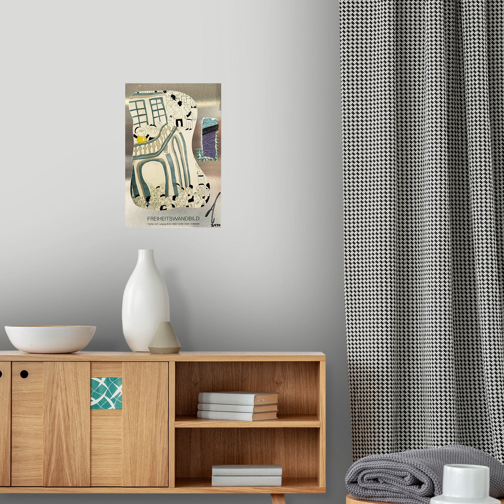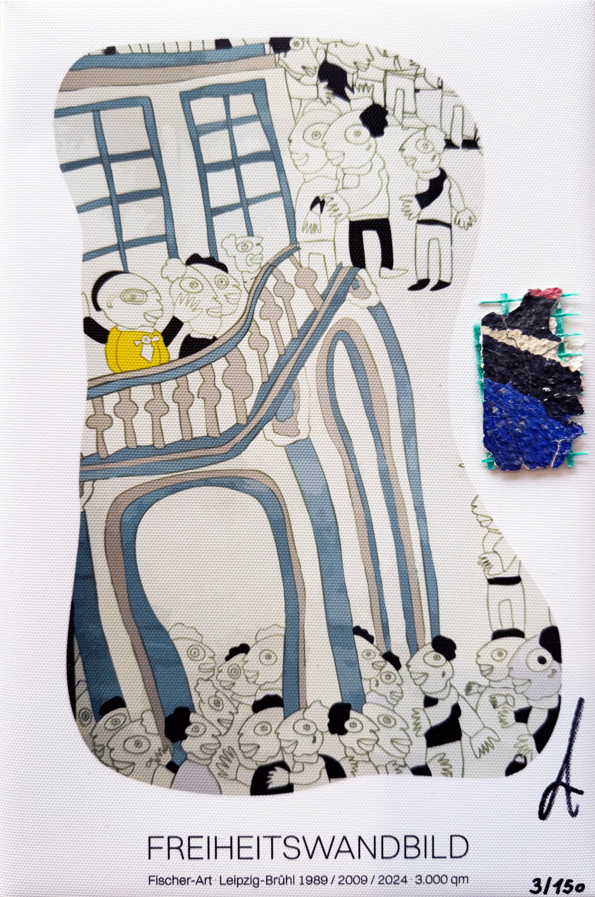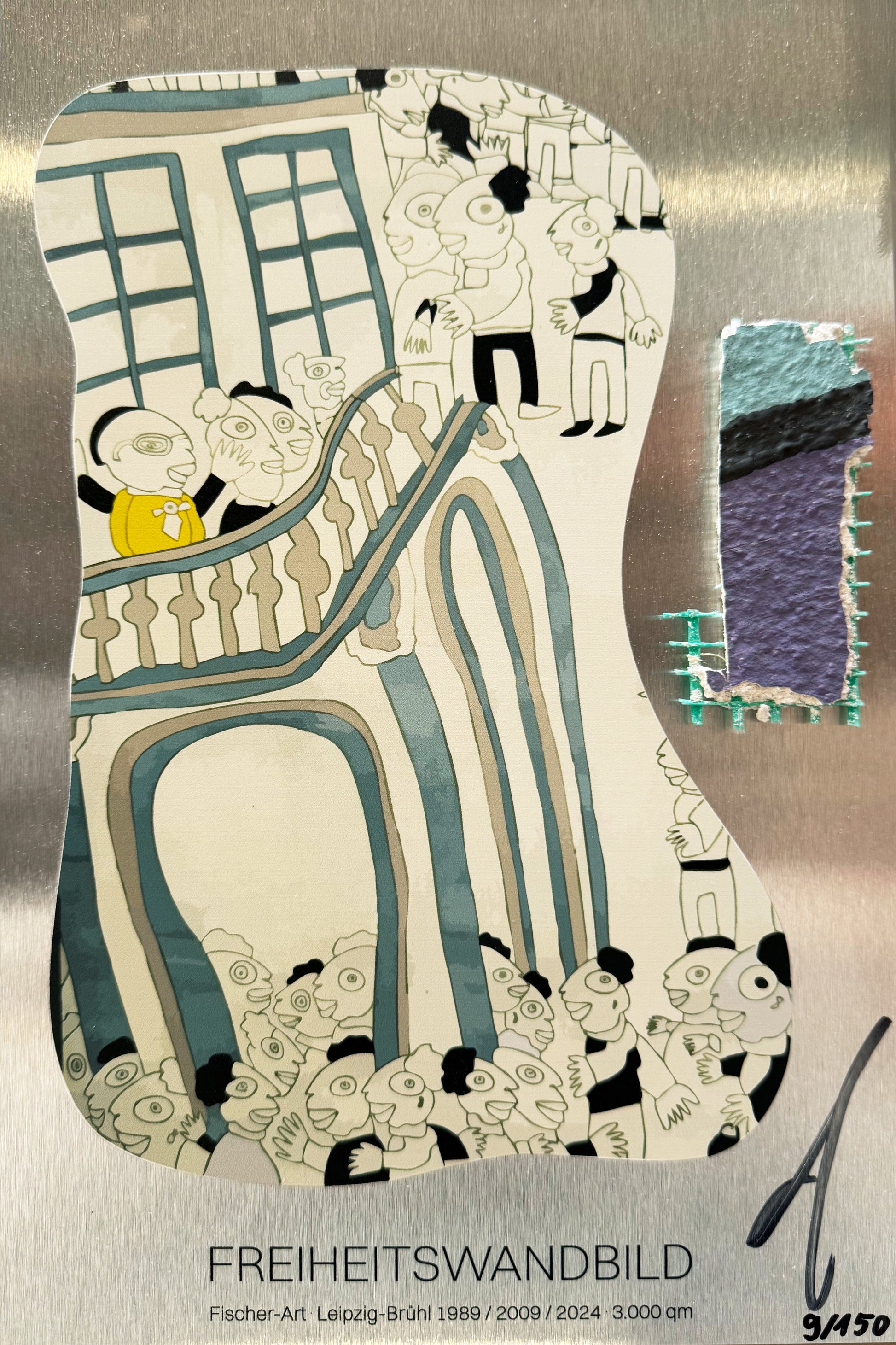 Sichere Dir ein echtes Stück Leipziger Stadtgeschichte mit unserem hochwertigen Kunstwerk "Blickpunkt Freiheit", entworfen von Michael Fischer Art. Dieses Produkt kombiniert ein originales Fragment des Wandgemäldes zur Friedlichen Revolution am Leipziger Brühl mit einer edlen Trägerplatte, die das Design "Blickpunkt Freiheit" trägt.