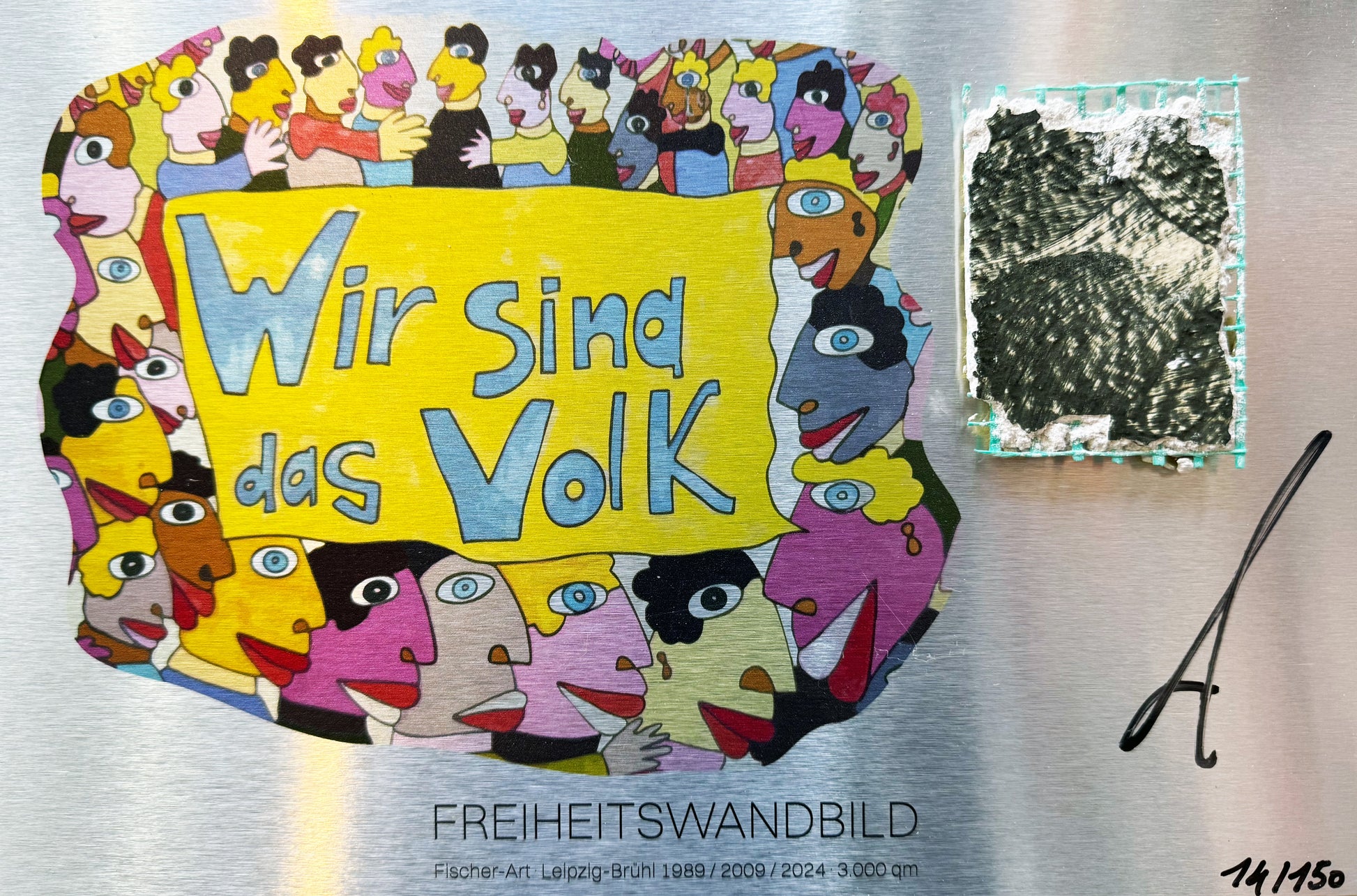 Sichere Dir ein echtes Stück Leipziger Stadtgeschichte mit unserem hochwertigen Kunstwerk "Volksruf", entworfen von Michael Fischer Art. Dieses Produkt kombiniert ein originales Fragment des Wandgemäldes zur Friedlichen Revolution am Leipziger Brühl mit einer edlen Trägerplatte, die das Design "Volksruf" trägt.
